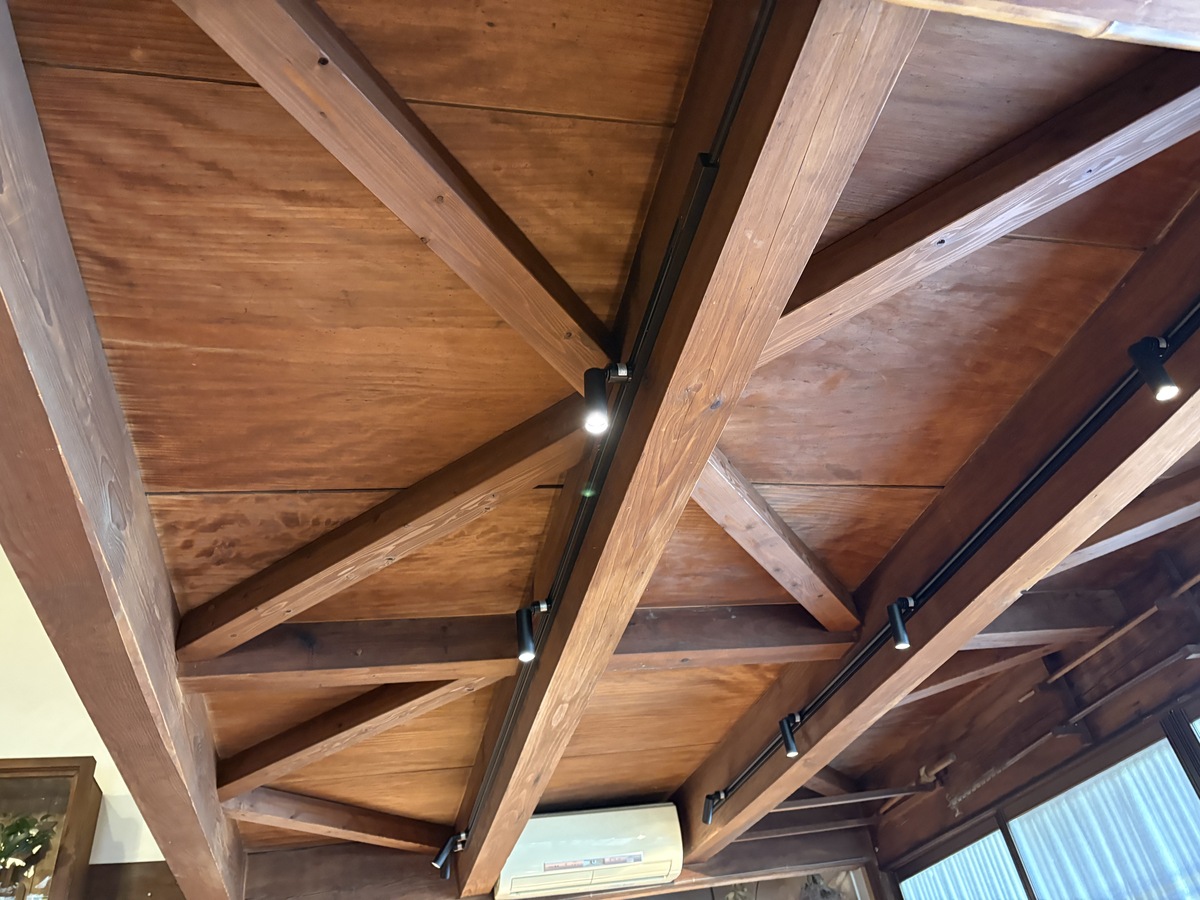 「文化財の耐震設計の考え方」をベースにして、元々頑丈な天井の梁に火打ち梁を使う限界耐震計算という古民家に適した手法で設計を行い施工しました。2階の居住スペースは耐震をメインに、1階のお客様スペースはデザイン性を重視して建物にもお店にも負担が少なくて済むよう留意しました。照明にもこだわって、お客様から雰囲気が良くなったと好評とのことです。