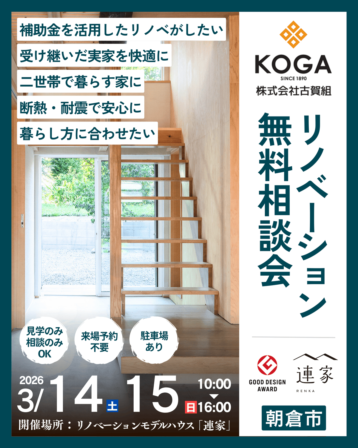 朝倉市にある、古賀組のモデルハウス「連家(れんか)」にて、2日間限定のリノベーション無料見学会を開催いたします。